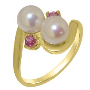Yellow Gold Cultured Pearl & Pink Tourmaline Womens Dress Ring