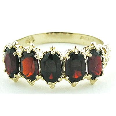 A beautiful Garnet Ring set with Five 6x4mm (0.24″x0.16″ inches) vibrant Garnetss in a gorgeous 9ct Gold setting. The ring also features a delightful carving on its shoulders.