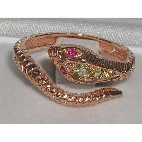 9ct Rose Gold Peridot & Ruby Snake Ring
