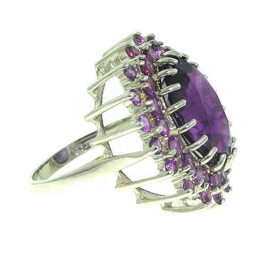 An impressive huge 9ct White Gold Amethyst Cluster ring set with a centre 16x12mm (0.64″x0.48″ inches) vibrant Amethyst complimented by eighteen 2.75mm (0.11″ inches) and eighteen 2.25mm (0.09″ inches) vibrant Amethysts. A real beauty and guaranteed to impress. Weighs over 8 grams so a substantial ring.