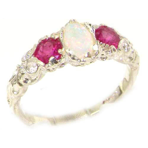 Ornate Victorian Inspired 14ct White Gold Opal & Ruby Trilogy Ring