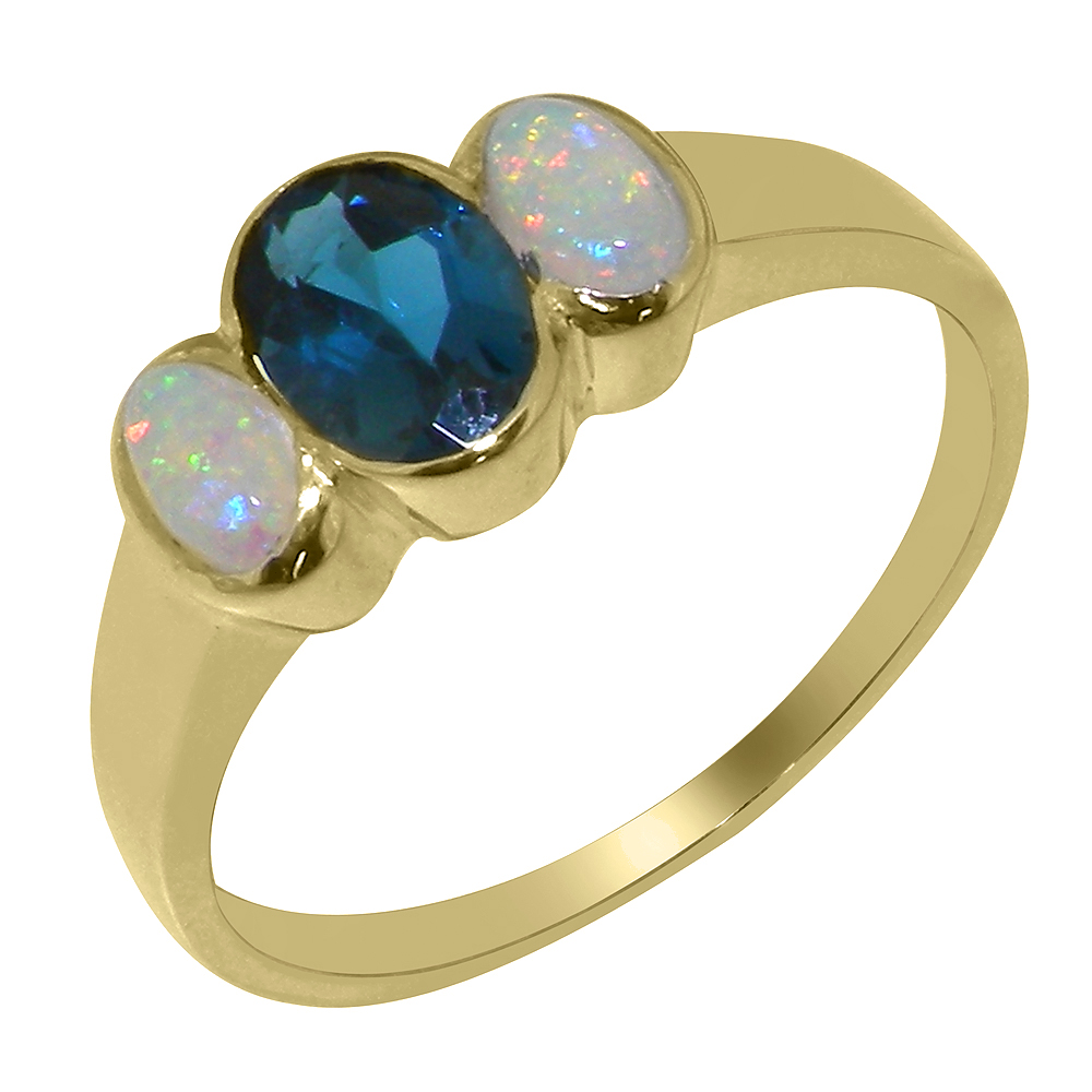 Solid Yellow Gold Natural London Blue Topaz & Opal Womens Trilogy Ring