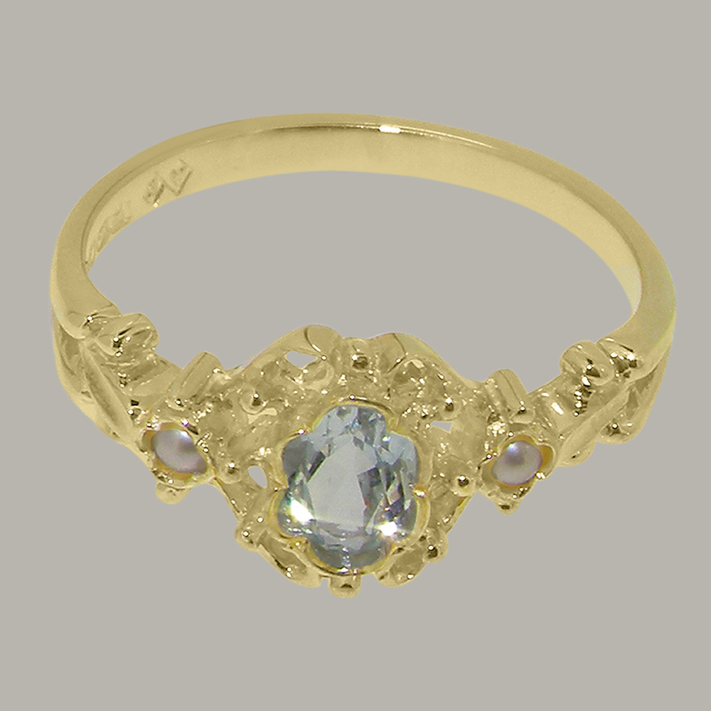 Yellow Gold Natural Aquamarine & Cultured Pearl Womens Trilogy Ring