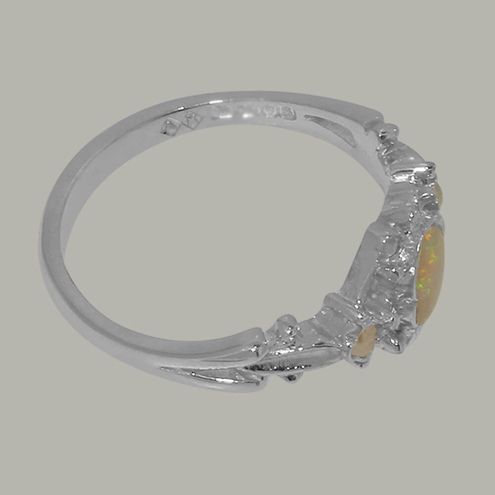 A dainty ornate Victorian inspired trilogy ring made from Solid 925 Sterling Silver and handset with a natural centre Australian Opal measuring 6×4 mm (0.24″ x 0.16″) and two 2.25mm (0.09″) round Cultured Freshwater Pearls